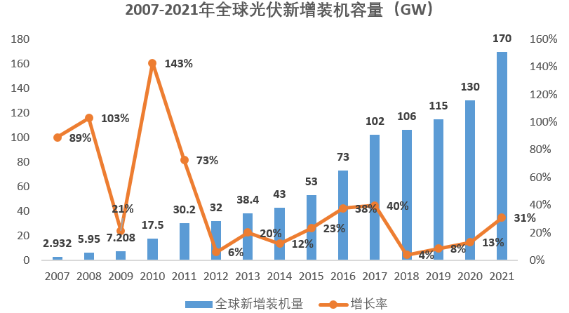 中國光伏行業(yè)協(xié)會數(shù)據(jù)顯示,2021年全球雖然受到部分原材料出現(xiàn)階段性緊缺、大宗商品漲價和物流成本快速上升的不利影響,但光伏新增裝機規(guī)模仍保持持續(xù)增長勢頭,同比增長31%,或?qū)⑦_到創(chuàng)紀錄的170GW。截至2021年底全球累計光伏裝機規(guī)模或?qū)⑦_到926GW,光伏發(fā)電已成為全球增長速度快的可再生能源品種。