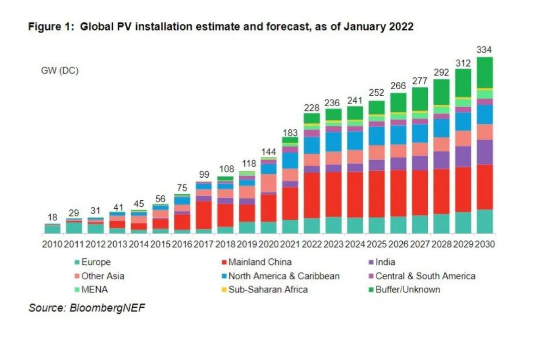 今年年初,BNEF彭博新能源財經(jīng)發(fā)布了2022至2030年各年度全球光伏裝機量預測:2022年全球?qū)⑿略龉夥b機228GW(dc),2030年這一數(shù)字將增加到334GW(dc)。